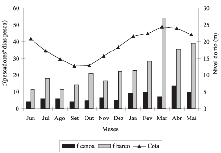 b) Durante o período da enchente e cheia os pescadores de canoas motorizadas e barcos aumentaram o esforço de pesca para compensar o menor rendimento desses períodos menos produtivos;