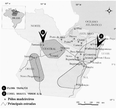 Figura 1 - Pólos madeireiros no Estado do Pará. Áreas de estudo localizadas no pólo Central (1) e Leste (2). Fonte: Verríssimo et al. (2002) com modificações.