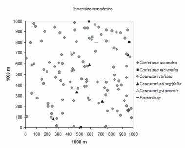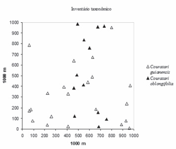 Os registros de herbários são utilizados na construção de mapas de ocorrência e distribuição geográfica das espécies (Fig 4). No entanto, somente os dados dos inventários mostram o comportamento das populações em diferentes regiões da Amazônia. A baixa densidade relativa de Couratari tauari demostra que os 200 ha estudados não foram suficientes para mostrar sua ocorrência e estrutura populacional. A coleta desta espécie, fora da área de estudo, na região do pólo madeireiro leste aparece como um novo registro de ocorrência para a Amazônia Oriental. Mesmo se considerado o esforço de coleta, esta espécie pode ser classificada como rara, pois existem poucos indivíduos nos inventários levantados e poucos registros nos herbários amazônicos visitados.