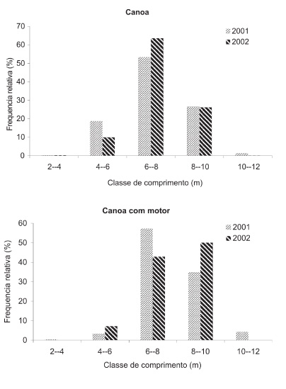 Foram registrados 297 desembarques de canoas motorizadas no período, as quais apresentaram comprimento entre 2 a 12 m, tamanho modal na classe de 6 a 8 m em 2001 e entre 8 e 10 m em 2002 (Figura 2).