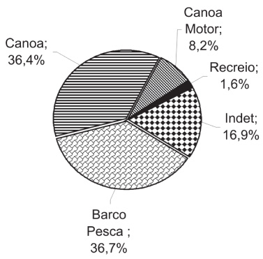 Foram identificados quatro tipos de embarcações utilizadas no desembarque de pescado nos anos de 2001 e 2002: canoas a remo, canoas motorizadas, barcos de pesca e recreios (embarcações de transporte de passageiros) (Tabela 1). Destaca-se a distinção entre canoas a remo e motorizadas, sendo que as canoas a remo apresentaram elevada ocorrência de pescarias nos lagos próximos ao centro de desembarque, e enquanto que as motorizadas (motor rabeta ou de centro) realizaram viagens mais longas, registrando sua ocorrência em outras sub-regiões. Algumas destas canoas inclusive são equipadas com urnas térmicas para a conservação do pescado, sendo chamadas de “canoas de caixa fixa”.