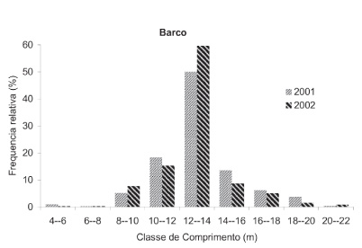 Tais barcos apresentaram comprimento em 2001 entre 4 e 22 m, com tamanho modal na classe de 12-14m, o qual se repetiu em 2002, apresentando amplitude de 8 a 22 m (Figura 4).