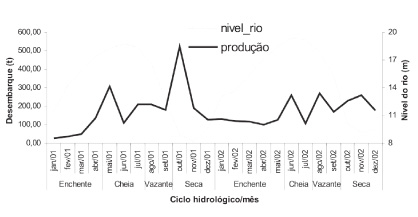 Na análise da produção mensal dos dez principais pescados em 2001 e 2002 (Tabelas 3 e 4), observou-se que curimatã, jaraqui, pacu e tambaqui são pescados frequentes no desembarque, ocorrendo em todos os meses, assim como foram frequentes aruanã (23 meses), cubiu (22 meses), mapará (20 meses) e a sardinha (17 meses). Exceção foi a piramutaba registrada em apenas seis meses, sendo o período de agosto a outubro de 2002 de grande produção.