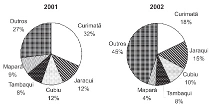 Entre as espécies mais desembarcadas nos anos de 2001 e 2002, a curimatã apresentou respectivamente 31,30% e 18,08% do total produzido, sendo seguida pelos jaraquis com 12,35% e 14,81%, o cubiu com 11,74% e 9,78%, o tambaqui com 8,40% e 8,16% e o mapará que representou 8,9% em 2001 e 4,07% em 2002, ano em que foi menos capturado do que a piramutaba, a qual representou 10,67% da produção (Figura 6).