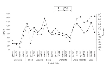 A variação da CPUE foi comparada com a variação dos resíduos do modelo, assumidos como indicadores da densidade de peixes no ambiente (Figura 7), tendo-se observado que estes apresentaram sentido de variação similar, com exceção de abril, agosto e dezembro de 2002. A magnitude dos recursos em relação à média também foi similar entre os dois indicadores até julho de 2002, a partir de quando o modelo linear indicou maior densidade do que a indicada pela CPUE.