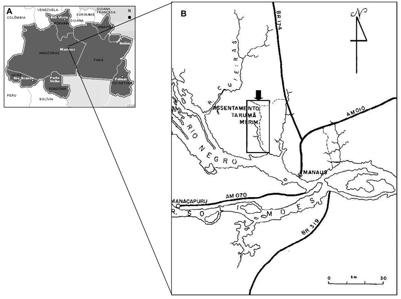 O assentamento Tarumã-Mirim está situado no ramal da rodovia BR-174 conhecido como Pau-Rosa, adentrando 8 km no km 21 da BR-174, no município de Manaus-AM (Figura 1). Possui uma área de aproximadamente 43 mil hectares de floresta primária de terra firme, onde 1042 famílias foram assentadas. As principais doenças que atingem a população do assentamento são: leishmaniose (onde em abril de 1999 aproximadamente 300 casos foram registrados), malária, gripes, helmintoses, hepatites e varicela (INCRA, 2000).