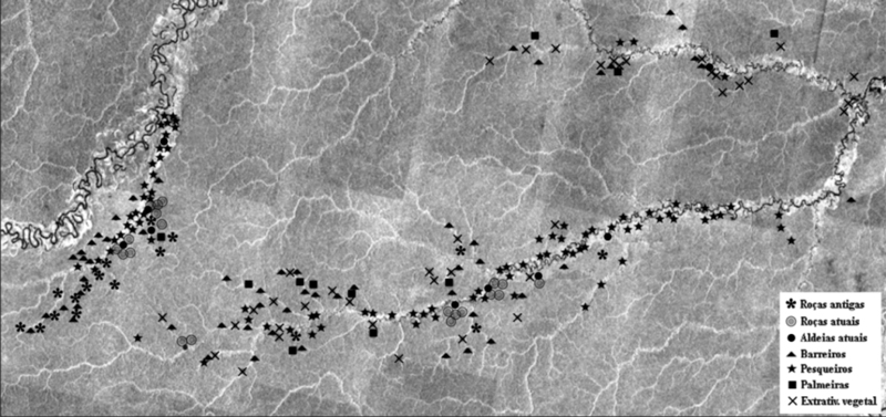 Na figura 2 estão mapeados os principais locais de obtenção e produção de recursos naturais, incluindo as áreas agrícolas. Nota-se um padrão de ocupação e de utilização do espaço basicamente ribeirinho, com exceção dos “centros”, locais atualmente utilizados para extração de copaíba, além das áreas de caça mais distantes.
