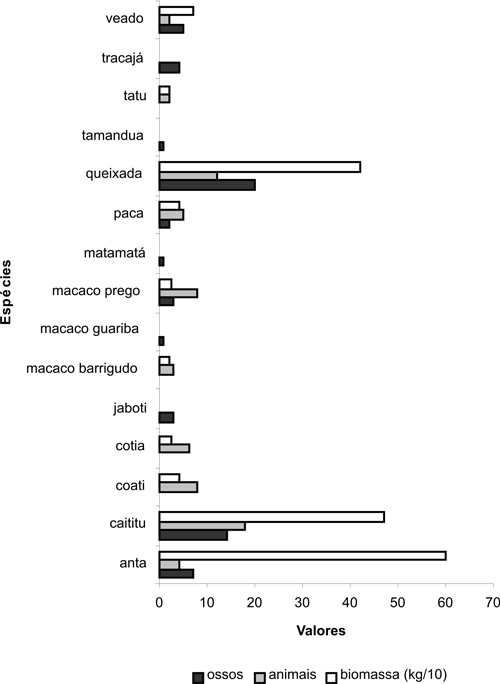 Os dados relativos ao número e à biomassa total de cada espécie caçada, e dos registros de ossos de animais consumidos nas residências, estão apresentados na Figura 3. Podemos observar que, tanto quanto ao número de animais abatidos, predominam os porcos selvagens taiassuídeos (queixada e caititu). Com relação à biomassa por espécie, a anta, queixada e o caititu representaram a principal fonte de proteína animal de caça para os Deni no período estudado.