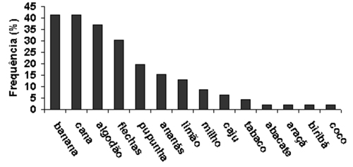 Além dos produtos que suprem o consumo diário de carbohidratos, observamos que banana, cana, algodão, pupunha e ananás eram os itens mais coletados pelos Deni, como se nota na Figura 4. Fica evidente, também, a importância dos cultivo de flechas, utensílio básico na manufatura do equipamento de pesca e caça para os Deni. Estas, no entanto, são coletadas em roças velhas, muitas vezes roças abandonadas. Observou-se a coleta de uma grande quantidade de flechas nas capoeiras, antigos roçados da antiga aldeia Marrecão, por índios da atual aldeia. Constatou-se a produção e uso intenso de algodão para a confecção de maqueiras (redes de dormir) e outros artigos. O padre João Derickx, tendo trabalhado nos anos 1980 na região do Juruá, também comenta em suas observações o constante empenho das índias no trabalho de tecer fios de algodão a partir do material coletado nos roçados, confeccionando maqueiras (Derickx 1992). Além de sua utilidade, estas maqueiras são esporadicamente vendidas a visitantes.