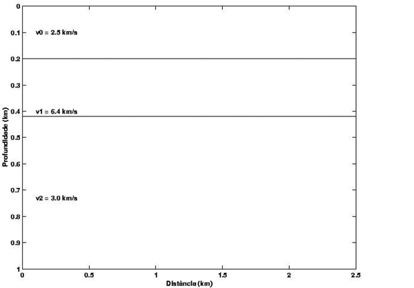 Os modelos sintéticos referidos para representar a bacia do Amazonas são: modelo A, representado pela figura 1 é composto por uma camada de alta velocidade e por interfaces planas horizontais sobre um semi-espaço infinito com a seguinte configuração: primeira camada de argila com velocidade de 2500 m/s, segunda camada de basalto com velocidade de 6400 m/s e por último a camada de calcário com a velocidade de 3000 m/s.
