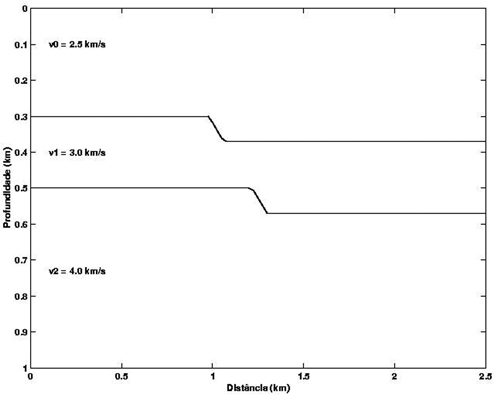 O modelo B, representado pela figura 2, tem como objetivo mostrar as difrações, é composto por um sistema de falhas normais com mergulhos acentuados, sobre um semi-espaço infinito, com a seguinte configuração: primeira camada de argila com velocidade de 2500 m/s, segunda camada de calcário com velocidade de 3000 m/s e por último a camada de arenito com velocidade de 4000 m/s.