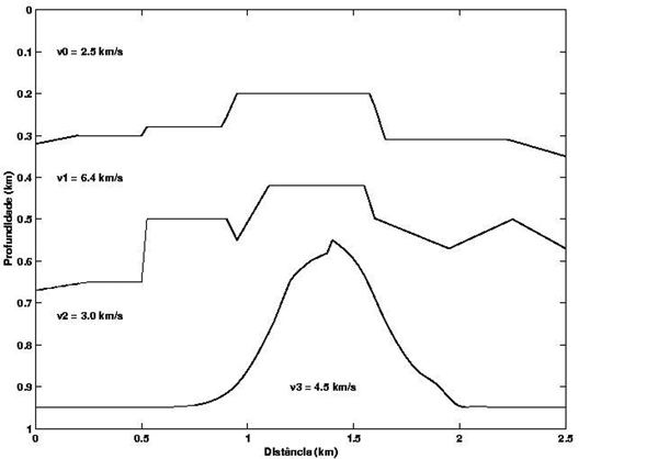 Figura 3 - Modelo geológico, tipo domo subjacente à estrutura de três camadas, sendo uma delas de alta velocidade, situação típica da Bacia do Amazonas.