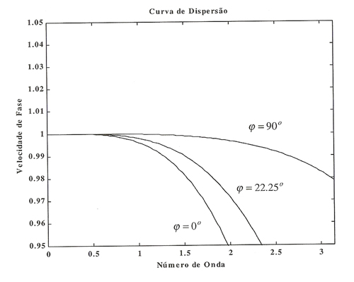 , (5) que define o critério de estabilidade para o esquema de quarta ordem. A figura 4 apresenta a velocidade de fase normalizada para diferentes ângulos de propagação, onde j é o ângulo entre a onda plana e o eixo x. Para que não ocorra dispersão numérica n deve ser igual a seis que corresponde ao número de pontos por comprimento de onda.