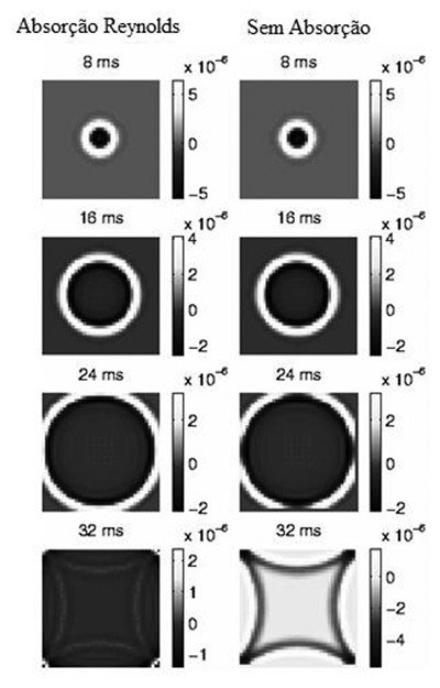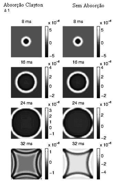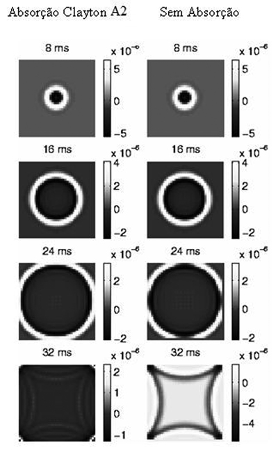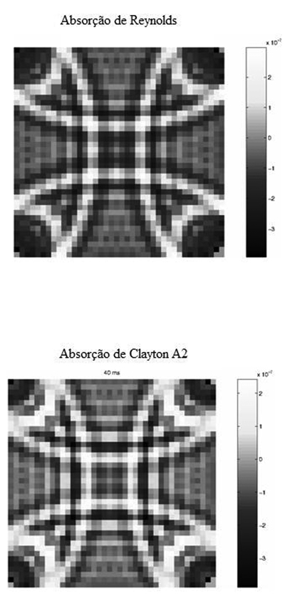 As figuras 6 e 7 mostram como estão relacionadas às condições de absorção A1 e A2 de Clayton, lado esquerdo, com uma fronteira sem condição de absorção lado direito. É observado que a condição de absorção A2é melhor do que a condição de absorção A1.