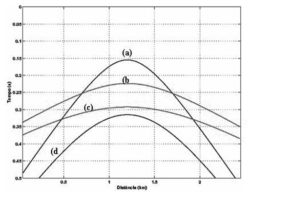 Figura 11 - Representa as curvas de tempos de Trânsitos obtidos pela Teoria do Raio, programa Seis88, onde (a) primeira reflexão, (b) segunda reflexão, (c) múltipla da segunda reflexão, (d) múltipla da primeira reflexão