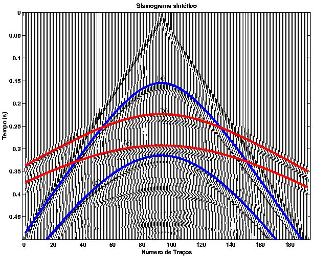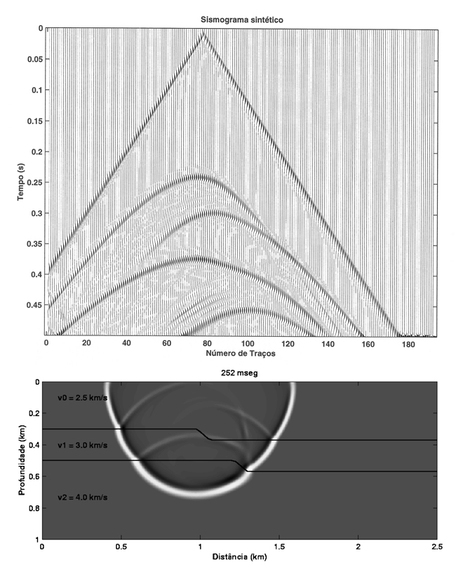Os dados sintéticos foram obtidos via método das diferenças finitas para resolver a equação da onda acústica (2-D), calculados pelo programa de diferenças finitas FDSKALAR (Sandmeier & Liebhardt, 1992). Neste trabalho a validação desse programa, utilizado para gerar os sismogramas e ‘snapshots’, foi comparada com o modelo A de modelagem Sísmica pela Teoria do Raio SEIS88 (Cerveny & Psencik, 1988). Observa-se que o resultado obtido pela Teoria do Raio (Figura 11) é semelhante ao resultado obtido por diferenças finitas (Figura 12), com isso comprova-se a validade do código computacional utilizado neste trabalho.
