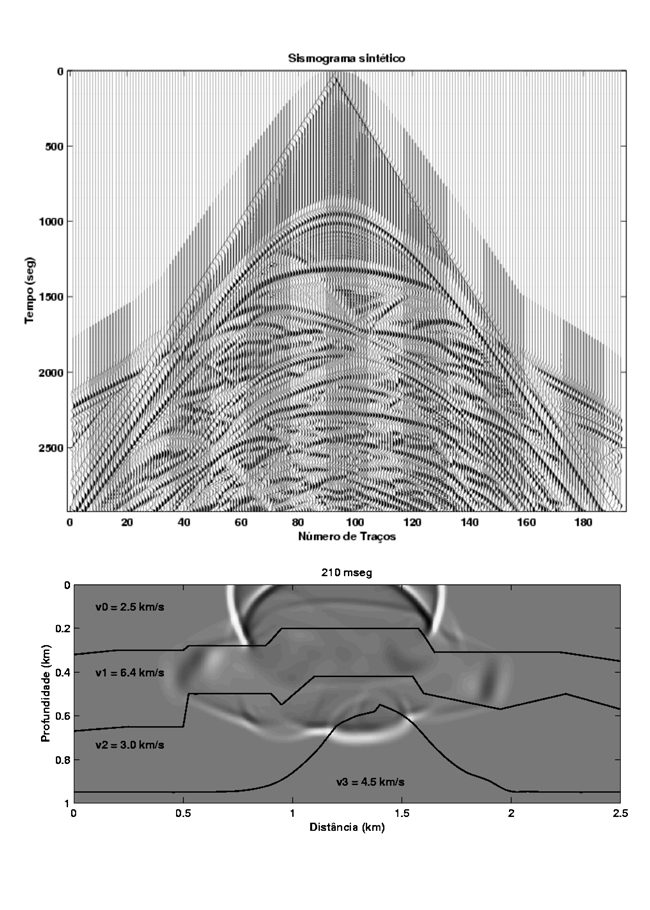 A existência de grande volume de rochas de composição basáltica, intercaladas na forma de soleiras nas unidades de origem sedimentar que constituem as bacias paleozóicas amazônicas, faz com que a propagação das ondas sísmicas apresente padrão bastante complexo, como a existência do espalhamento por difração das ondas sísmicas nas áreas de mergulhos acentuados, próxima às zonas de falhas com planos verticais ou geradas por movimentação de domo salino. Isso dificulta o trabalho de interpretação sísmica na definição de alvos localizados abaixo das soleiras. Para contornar esta dificuldade, foi necessário um adequado tratamento dos dados sísmicos que tiveram como objetivo melhorar a definição da imagem sísmica nestas regiões. Para isto, foram utilizados modelos acústicos bidimensionais (2-D), com massa específica considerada constante e velocidade de propagação da onda variável em todo o espaço. Os dados de entrada para a geração do sismograma e “snapshots” são parâmetros relativos à fonte e receptores, além da matriz de velocidade.