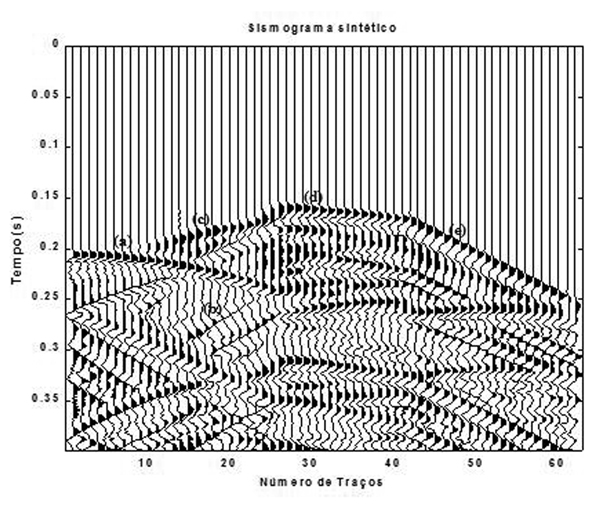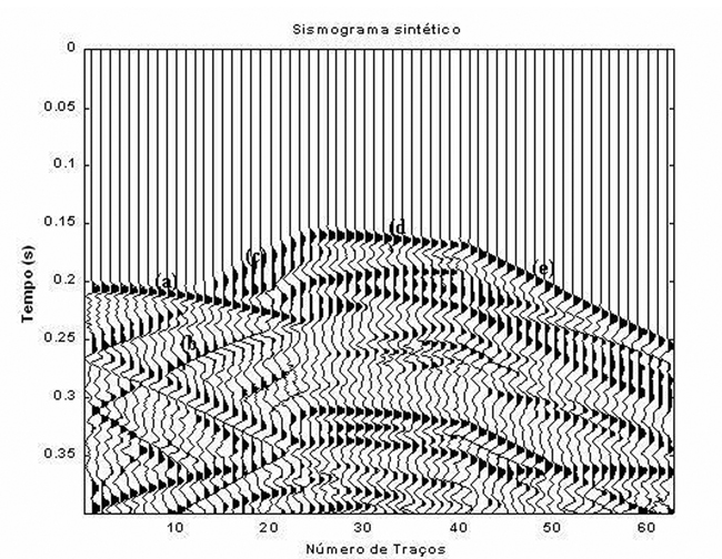 Para se ter melhor controle na análise e obtenção dos resultados foram feitos dois poços localizados a 700 m e 1700 m a partir do eixo de origem de coordenadas cartesianas (x,y) igual à zero na superfície. O poço na posição de 700 m, referente ao modelo C, é o que apresentou melhor resultado no sismograma da figura 15, com os seguintes eventos: (a) onda transmitida 1a camada, (b) reflexão da 1a camada, (c) ‘head wave’, (d) onda transmitida 2a camada e (e) onda transmitida 3a camada.