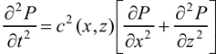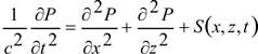 O campo de onda acústica é descrito por P(x,z,t) e u(x,z,t), onde P é o campo de pressão e u é o deslocamento da partícula. Assumindo que o campo de pressão é invariável na direção do eixo y, então a derivada em relação a y é zero, obtendo-se a equação da onda escalar (2-D) com densidade constante, expressa por: