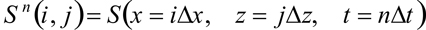 onde P(x,z,t) campo de pressão, c(x, y) é a velocidade, x e z coordenadas, t tempo e S(x, z, t) termo fonte. Notação numérica,