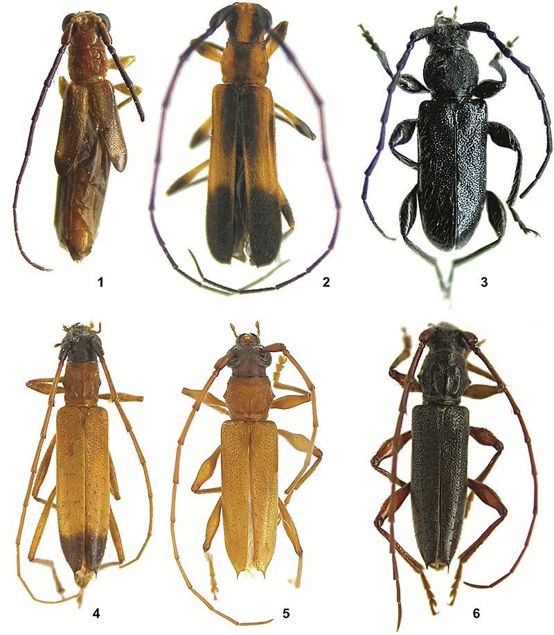 Figuras 1-6 - Habitus. 1. Kalore minima sp. nov., holótipo macho, comprimento 6,2 mm; 2. Olexandrella rafaeli sp. nov., holótipo fêmea, comprimento 7,4 mm; 3. Curtomerus lingafelteri sp. nov., holótipo macho, comprimento 17,2 mm; 4. Mephritus apicepullus sp. nov., holótipo macho, comprimento 12,6 mm; 5. Mephritus vescus sp. nov., holótipo macho, comprimento 8,5 mm; 6. Mephritus estoni sp. nov., holótipo macho, comprimento 13,2 mm.